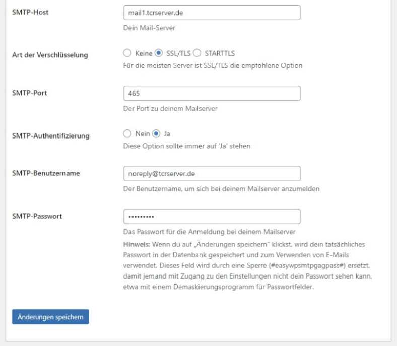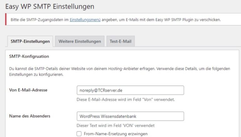 Sobald das Plugin installiert und aktiviert wurde, sollte man in die Einstellungen des Plugins wechseln Einstellungen > Easy WP SMTP und dort die Zugangsdaten des Postfaches eintragen, welches die E-Mail versenden soll.